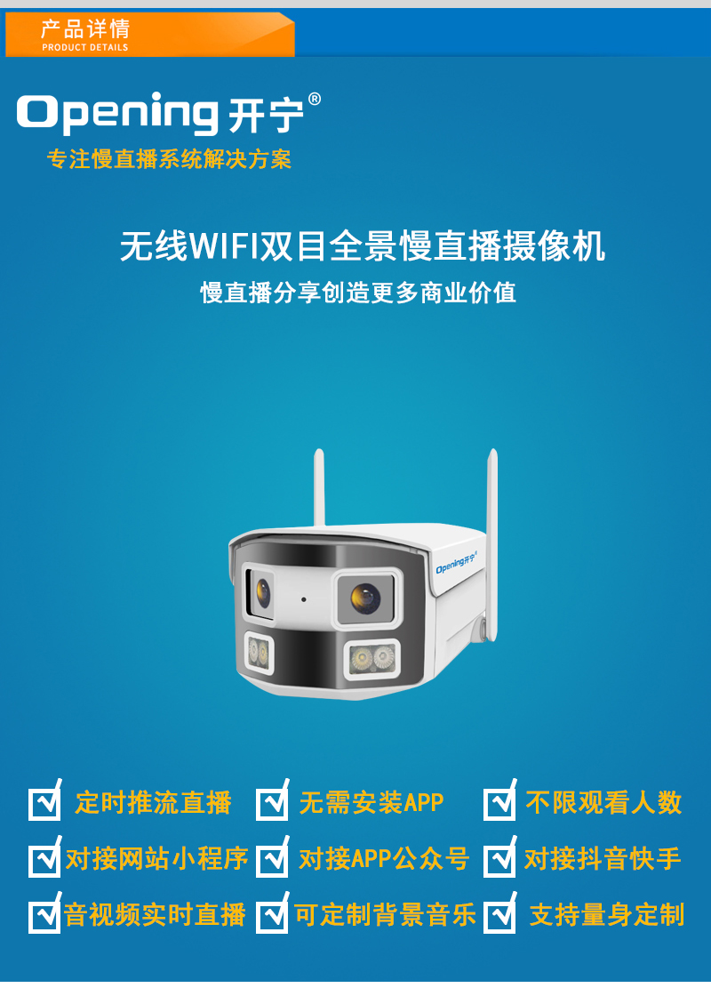- 1、400萬雙目拼接雙光槍式慢直播攝像機,1個攝像機就是一套慢直播系統(tǒng);雙目拼接180度超廣角;