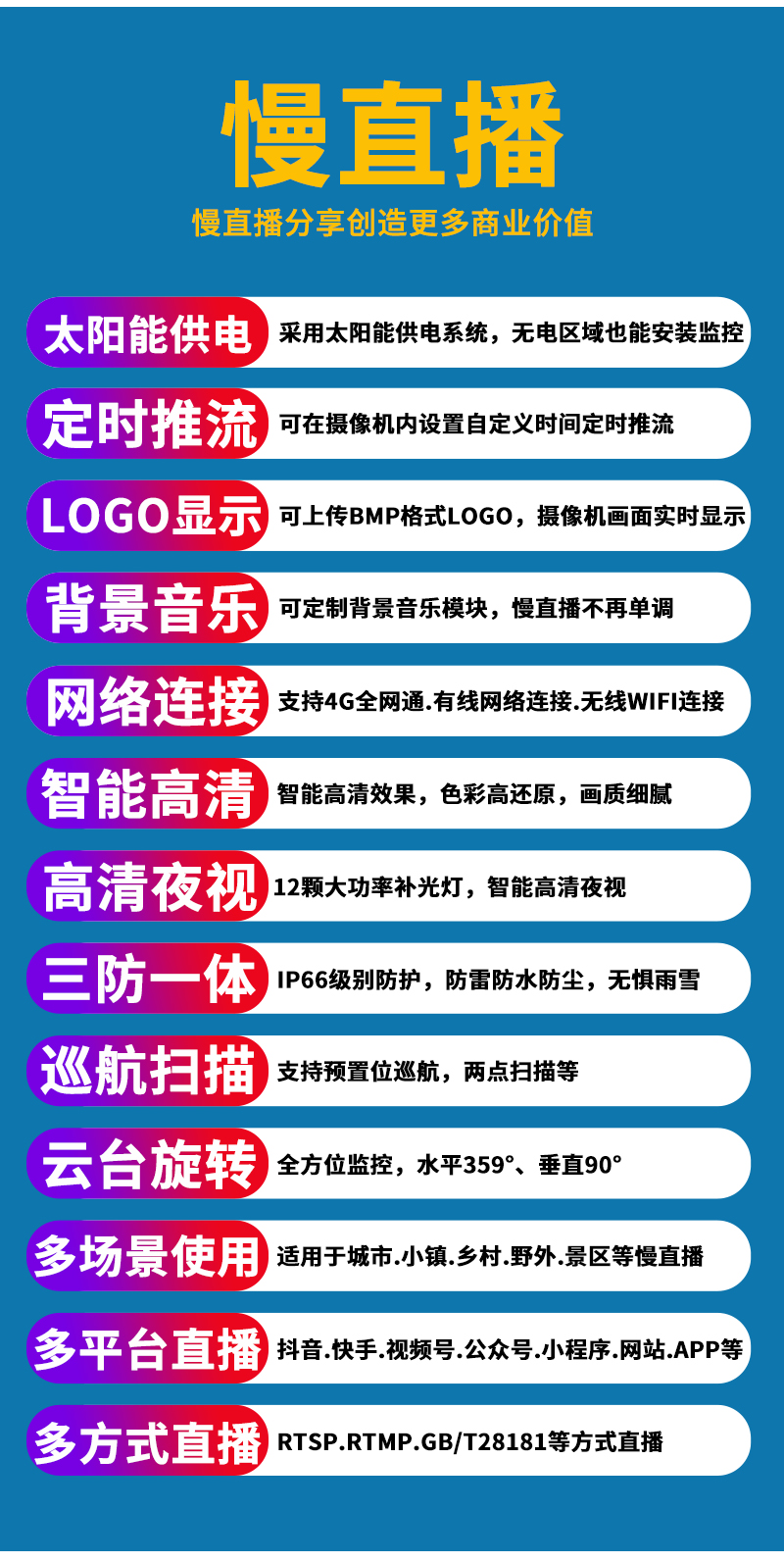 3、明廚亮灶.食品溯源.城市慢直播.美麗鄉(xiāng)村.農(nóng)業(yè)慢直播.景點慢直播.戶外慢直播等慢直播;