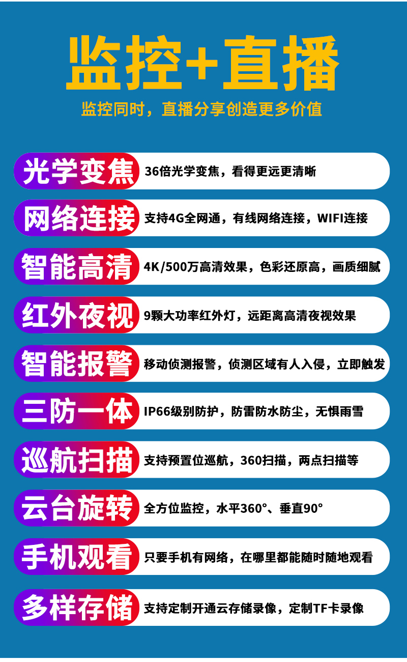 - 1、500萬/800萬7寸36倍監(jiān)控直播智能高清球機,一個球機就是一套監(jiān)控直播系統(tǒng);支持360度旋轉(zhuǎn),最高轉(zhuǎn)速可達60度/S,支持預置點和巡航,36倍光學變焦,半金屬外觀,IP66防水等級;