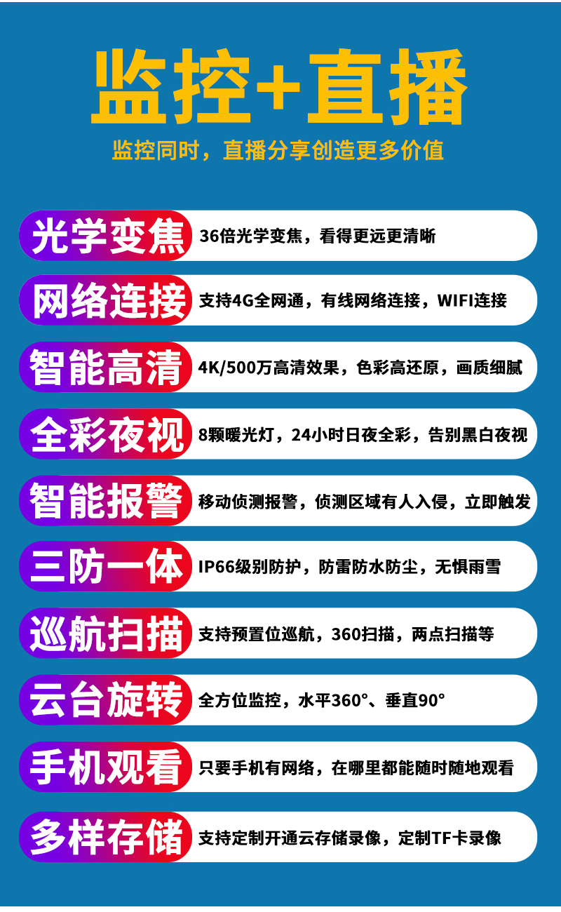 - 1、500萬/800萬6寸36倍監(jiān)控直播智能高清球機,一個球機就是一套監(jiān)控直播系統(tǒng);支持360度旋轉(zhuǎn),最高轉(zhuǎn)速可達60度/S,支持預(yù)置點和巡航,36倍光學(xué)變焦,半金屬外觀,IP66防水等級;