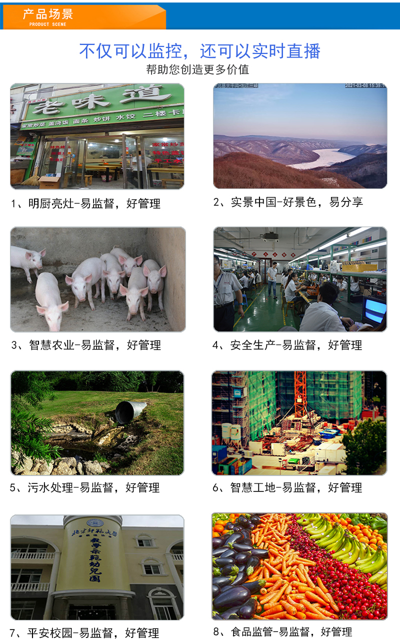 3、明廚亮灶.透明裝修.智慧農(nóng)業(yè).食品溯源.實(shí)景中國.在線驗(yàn)廠.店鋪直播.展會直播等實(shí)時(shí)監(jiān)控直播;