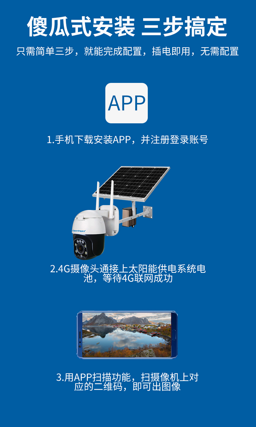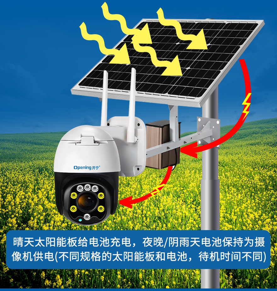 - ★這是一款開寧4G無線太陽能供電監(jiān)控系統(tǒng),一個機器就相當于一套監(jiān)控系統(tǒng),無電無網(wǎng)也可以使用;