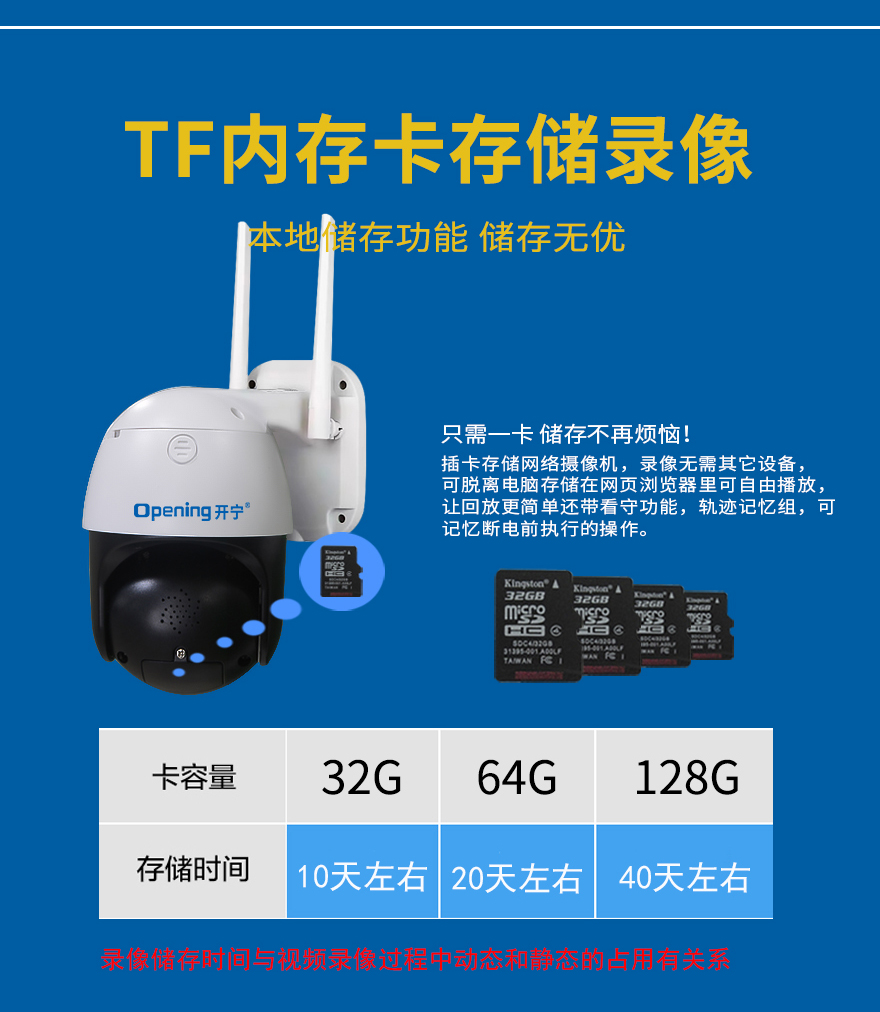 ★全天候環(huán)境設計,室外安裝,支持32/64/128G內存卡(32GB以上需要使用FAT32格式化才能使用);