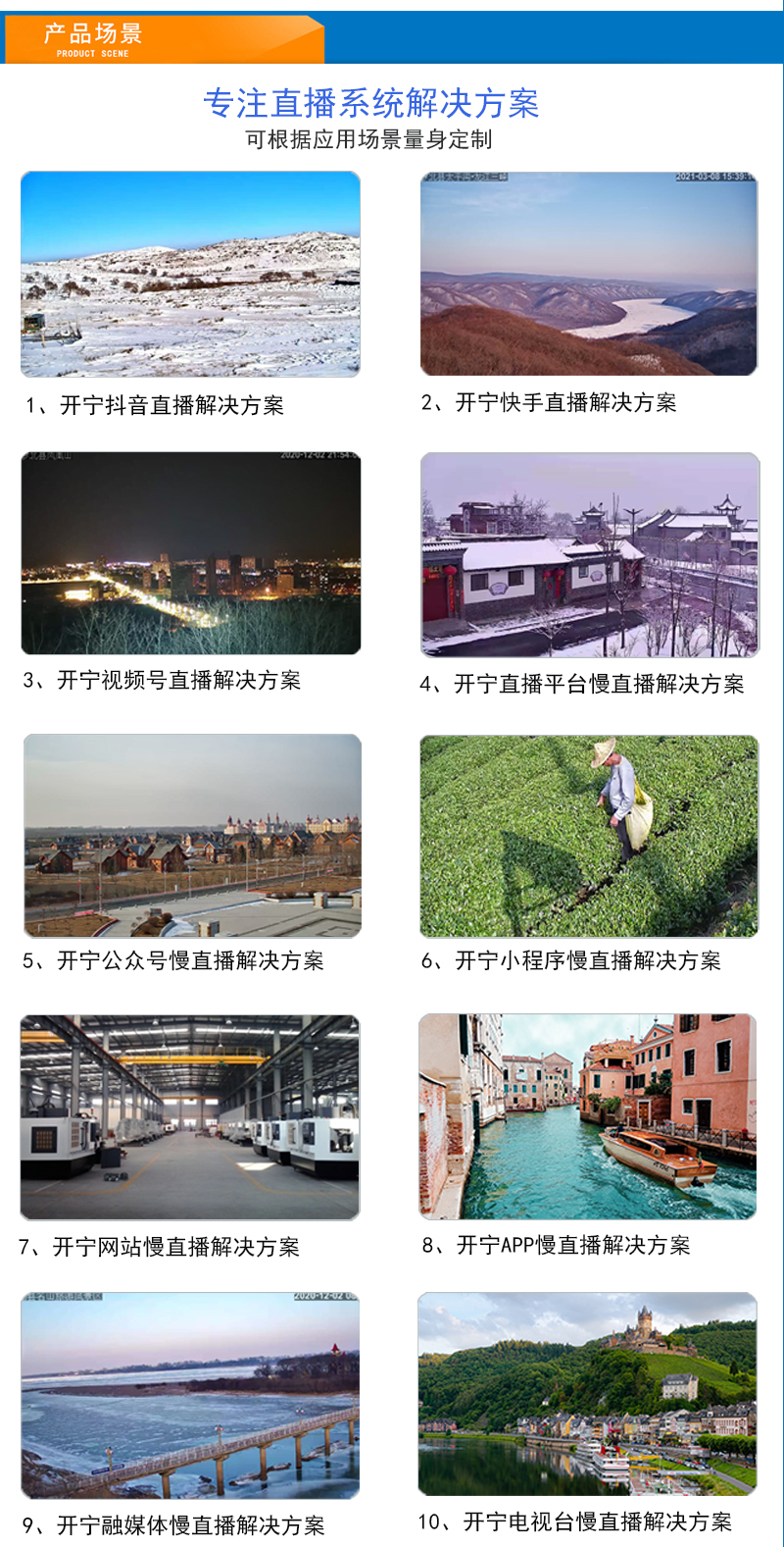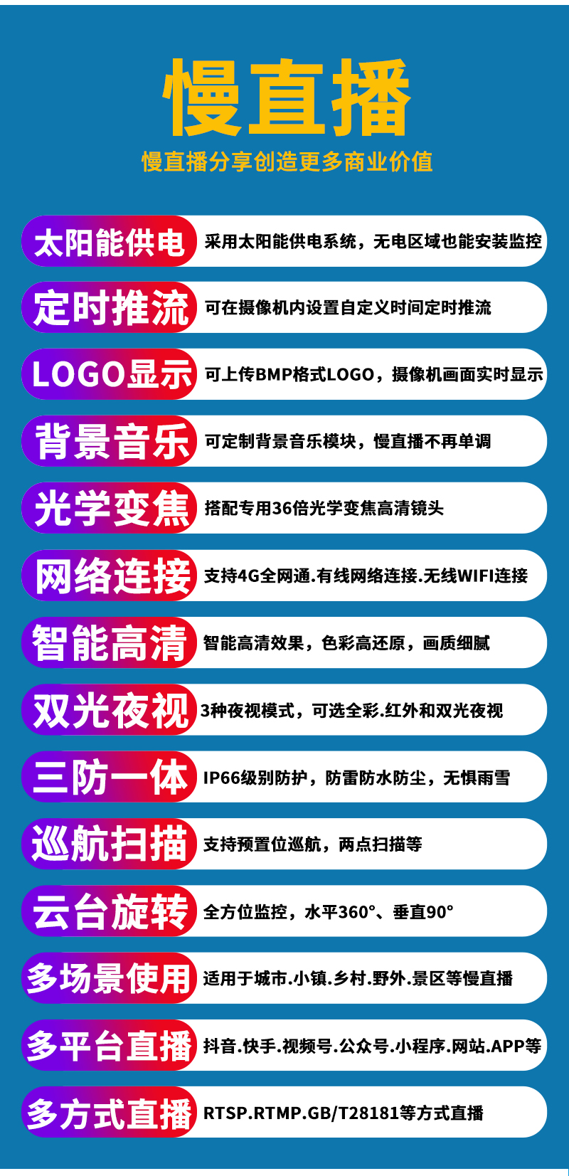 2、內(nèi)置智能4G模塊,沒(méi)有寬帶網(wǎng)絡(luò)的地方也能實(shí)現(xiàn)實(shí)時(shí)慢直播; 3、不僅可以監(jiān)控監(jiān)管錄像,還可以實(shí)時(shí)慢直播分享創(chuàng)造更多商業(yè)價(jià)值; 、4、美景中國(guó).智慧景區(qū).城市慢直播.動(dòng)物慢直播.融媒體慢直播.央視頻慢直播.戶外直播等慢直播;