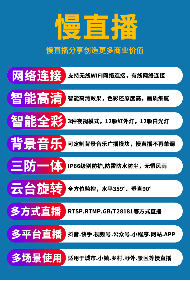 - 1、300萬(wàn)有線/WIFI慢直播智能小球,一個(gè)小球就是一套慢直播系統(tǒng); 2、不僅可以監(jiān)控監(jiān)管,還可以實(shí)時(shí)慢直播分享創(chuàng)造更多商業(yè)價(jià)值; 3、明廚亮灶.在線驗(yàn)廠.城市慢直播.美麗鄉(xiāng)村.農(nóng)業(yè)慢直播.幼兒園慢直播.戶外慢直播等慢直播; 4、無(wú)需下載安裝APP,簡(jiǎn)單實(shí)用;不限觀看人數(shù),創(chuàng)造更多商業(yè)價(jià)值; 5、RTMP推流直播高清攝像頭;可生成慢直播二維碼,只需掃碼即可觀看慢直播; 6、可接入網(wǎng)站.公眾號(hào).小程序.APP;可對(duì)接抖音.快手.視頻號(hào).淘寶.拼多多等平臺(tái); 7、支持GB28181協(xié)議;可接公安.食品.工地.生產(chǎn).教育.畜牧.旅游等監(jiān)管部門平臺(tái); 8、高清慢直播、本地錄像錄音、報(bào)警多功能于一體;支持64/128G/256G內(nèi)存卡; 9、12顆高效能點(diǎn)陣紅外燈,12顆高效能點(diǎn)陣白光燈,鏡頭4MM/6MM可選,夜視5-50米; 10、APP可選擇紅外模式、全彩模式和智能模式三種模式其中一種模式; 11、智能模式,沒有物體移動(dòng)紅外燈亮,有物體移動(dòng)白光燈亮; 12、內(nèi)置高清保真拾音器,有聲有色實(shí)時(shí)直播;高清晰喇叭,APP語(yǔ)音對(duì)講,智能語(yǔ)音警戒報(bào)警;DC12V供電; 13、免費(fèi)提供集中管理平臺(tái),可實(shí)現(xiàn)集中管理慢直播攝像頭,有效提高工作效率; 14、人形檢測(cè)報(bào)警、移動(dòng)偵測(cè)報(bào)警、自動(dòng)跟蹤,手機(jī)推送。
