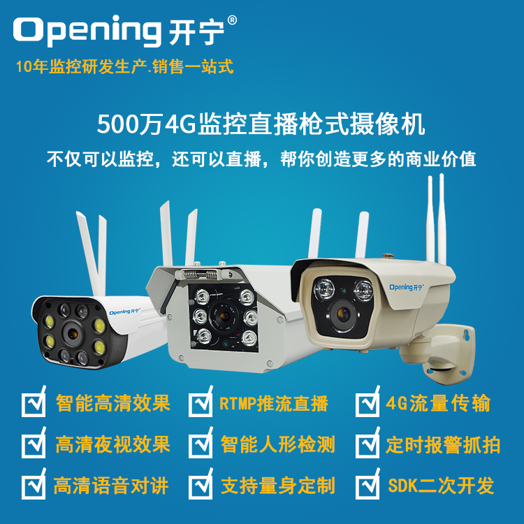 - 1、200萬/500萬4G智能監(jiān)控直播網(wǎng)絡(luò)高清防水攝像機,一個攝像機就是一套監(jiān)控直播系統(tǒng);