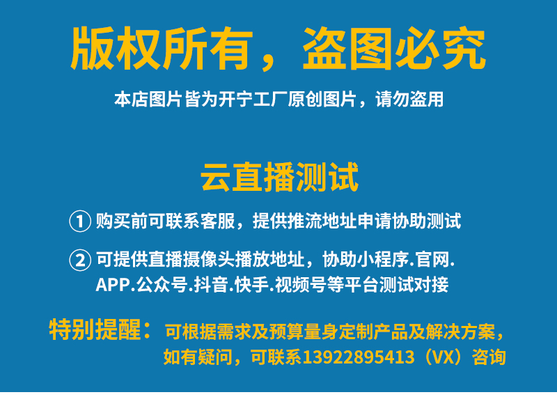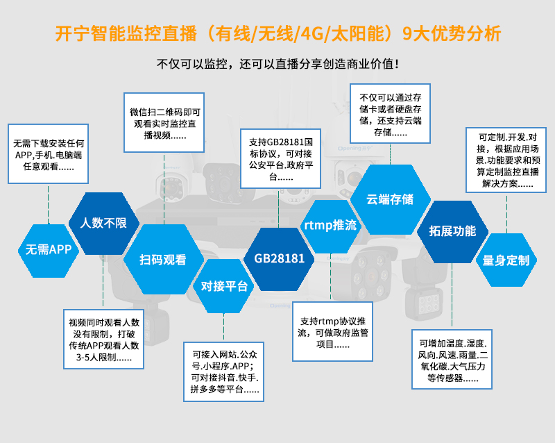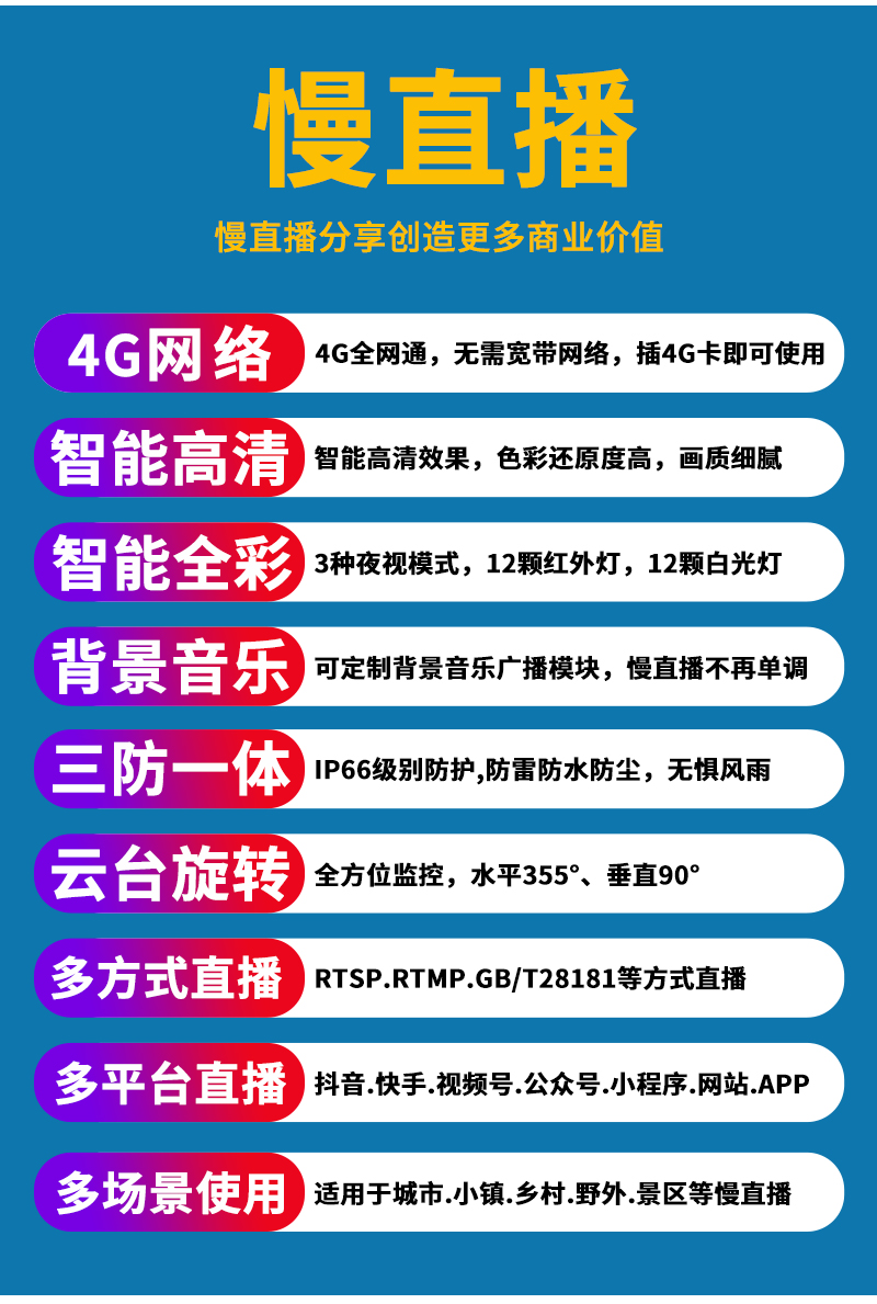 - 1、4G300萬(wàn)慢直播智能小球,一個(gè)小球就是一套慢直播系統(tǒng); 2、不僅可以監(jiān)控監(jiān)管,還可以實(shí)時(shí)慢直播分享創(chuàng)造更多商業(yè)價(jià)值; 3、明廚亮灶.食品溯源.城市慢直播.美麗鄉(xiāng)村.農(nóng)業(yè)慢直播.景點(diǎn)慢直播.戶(hù)外慢直播等慢直播; 4、無(wú)需下載安裝APP,簡(jiǎn)單實(shí)用;不限觀看人數(shù),創(chuàng)造更多商業(yè)價(jià)值; 5、RTMP推流直播高清攝像頭;可生成慢直播二維碼,只需掃碼即可觀看慢直播; 6、可接入網(wǎng)站.公眾號(hào).小程序.APP;可對(duì)接抖音.快手.視頻號(hào).淘寶.拼多多等平臺(tái); 7、支持GB28181協(xié)議;可接公安.食品.工地.生產(chǎn).教育.畜牧.旅游等監(jiān)管部門(mén)平臺(tái); 8、內(nèi)置智能4G模塊,沒(méi)有寬帶網(wǎng)絡(luò)的地方也能實(shí)現(xiàn)實(shí)時(shí)慢直播;另外支持有線(xiàn)功能; 9、支持64/128G/256G內(nèi)存卡;可另選配太陽(yáng)能供電系統(tǒng)實(shí)現(xiàn)無(wú)電無(wú)網(wǎng)實(shí)時(shí)慢直播; 10、12顆高效能點(diǎn)陣紅外燈,12顆高效能點(diǎn)陣白光燈,鏡頭4MM/6MM可選,夜視5-50米; 11、APP可選擇紅外模式、全彩模式和智能模式三種模式其中一種模式; 12、智能模式,沒(méi)有物體移動(dòng)紅外燈亮,有物體移動(dòng)白光燈亮; 13、內(nèi)置高清拾音器,有聲有色實(shí)時(shí)直播;高清晰喇叭,APP語(yǔ)音對(duì)講,語(yǔ)音警戒報(bào)警;DC12V供電; 14、免費(fèi)提供集中管理平臺(tái),可實(shí)現(xiàn)集中管理慢直播攝像頭,有效提高工作效率;