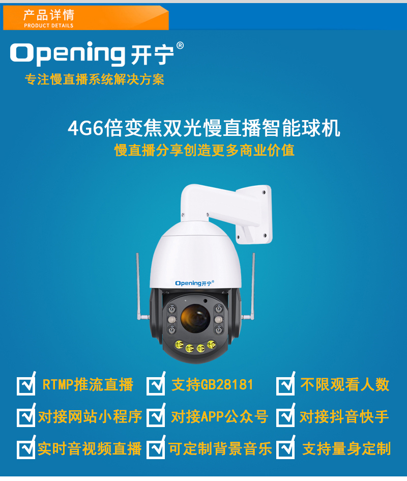 - 1、4G400萬/500萬/4K800萬/1200萬4寸6倍變焦全彩慢直播智能球機(jī),一個(gè)球機(jī)就是一套慢直播系統(tǒng);支持360度旋轉(zhuǎn),6倍光學(xué)變焦,半金屬外觀,IP66防水等級; 2、內(nèi)置智能4G模塊,沒有寬帶網(wǎng)絡(luò)的地方也能實(shí)現(xiàn)實(shí)時(shí)慢直播; 3、支持4G/WiFi/有線連接,沒有寬帶網(wǎng)絡(luò)用4G流量,有寬帶網(wǎng)絡(luò)可用wifi/網(wǎng)線連接; 4、不僅可以監(jiān)控監(jiān)管錄像,還可以實(shí)時(shí)慢直播分享創(chuàng)造更多商業(yè)價(jià)值; 5、美景中國.城市慢直播.文旅慢直播.融媒體慢直播.央視頻慢直播.交通慢直播.戶外直播等慢直播 6、無需下載安裝APP,簡單實(shí)用;不限觀看人數(shù),創(chuàng)造更多商業(yè)價(jià)值; 7、RTMP推流直播高清攝像頭;可生成慢直播二維碼,只需掃碼即可觀看慢直播; 8、可接入網(wǎng)站.公眾號.小程序.APP;可對接抖音.快手.視頻號.京東.淘寶.拼多多等平臺; 9、支持GB28181協(xié)議;可接公安.食品.工地.生產(chǎn).教育.畜牧.旅游等監(jiān)管部門平臺; 10、支持另外定制內(nèi)置插卡,可存儲卡存儲錄像; 11、6顆高效能點(diǎn)陣暖光燈,全彩夜視1-80米;6倍光學(xué)高清變焦鏡頭; 12、內(nèi)置高清保真拾音器,聲音視頻同步慢直播;DC12V供電; 13、免費(fèi)提供集中管理平臺,可實(shí)現(xiàn)集中管理慢直播設(shè)備,有效提高工作效率;; 14、慢直播首選4K800萬智能全彩超高清智能球機(jī),美景中國、實(shí)景中國慢直播好幫手! 15、水平360度無限位旋轉(zhuǎn),垂直90度;水平轉(zhuǎn)速40度/秒,垂直轉(zhuǎn)速30度/秒;支持256個(gè)預(yù)置位 8組巡航8組掃描,支持水平掃描,2點(diǎn)區(qū)域掃描,隨機(jī)掃描;