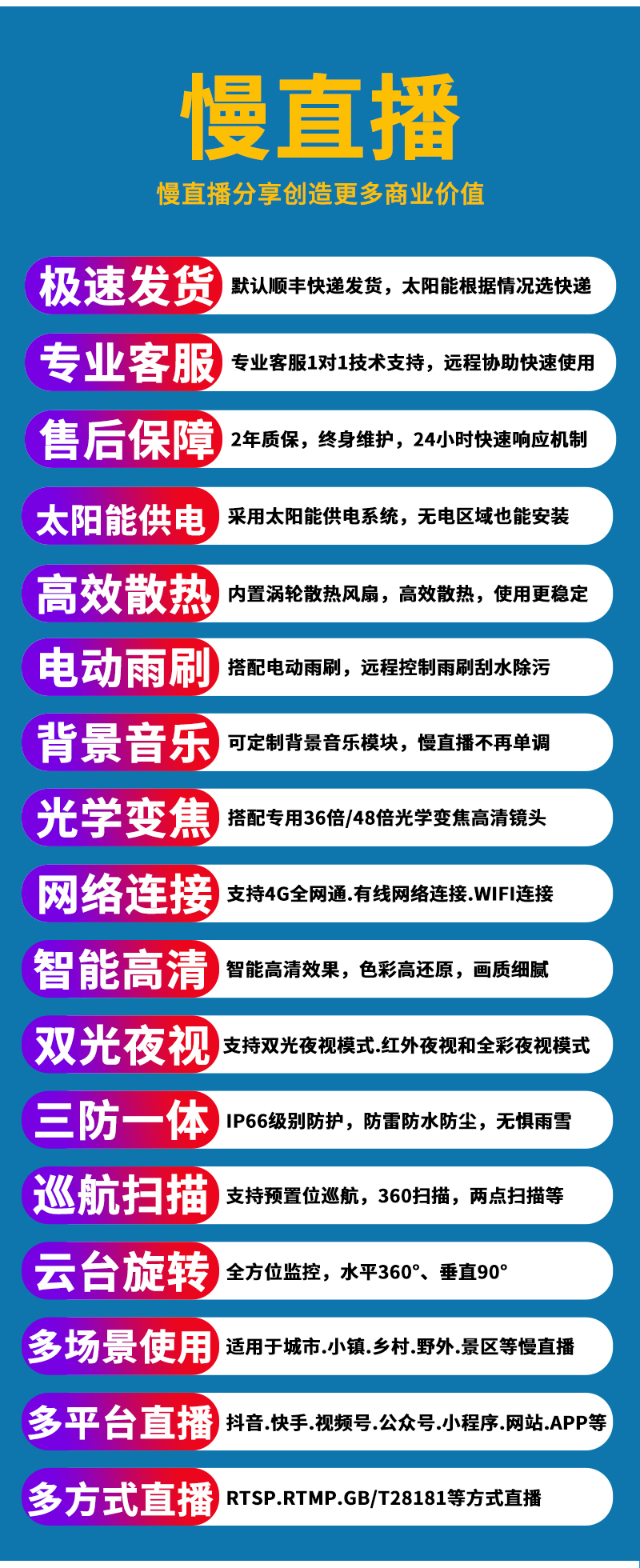 - 1、500萬/800萬6寸4G全彩慢直播智能雨刷球機,一個球機就是一套慢直播系統(tǒng);支持360度旋轉(zhuǎn),36倍/46倍光學變焦,半金屬外觀,IP66防水等級;