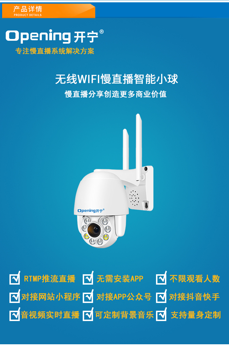 - 1、6倍變焦300萬有線/WIFI慢直播智能小球,一個球機就是一套慢直播系統(tǒng);支持水平和垂直旋轉(zhuǎn);