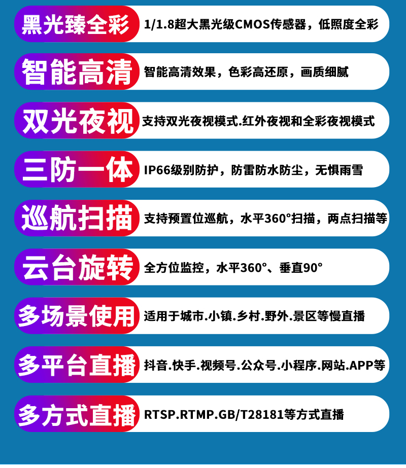 - 1、4K800萬6寸20倍雙光全彩慢直播智能球機,一個球機就是一套慢直播系統(tǒng);水平360度無限位旋轉(zhuǎn),垂直100度旋轉(zhuǎn);支持256個預(yù)置位 8組巡航8組掃描,支持水平掃描,2點區(qū)域掃描,隨機掃描;20倍光學(xué)變焦,2倍數(shù)字變倍,金屬外觀,IP66防水等級;